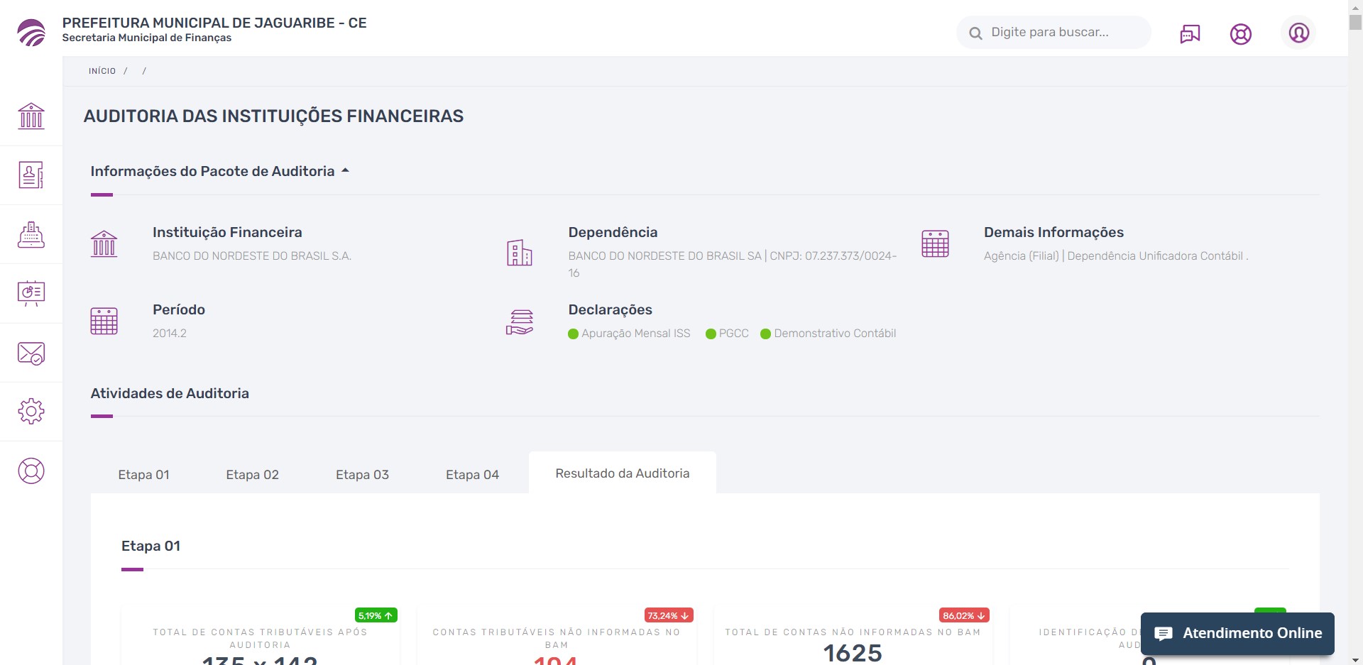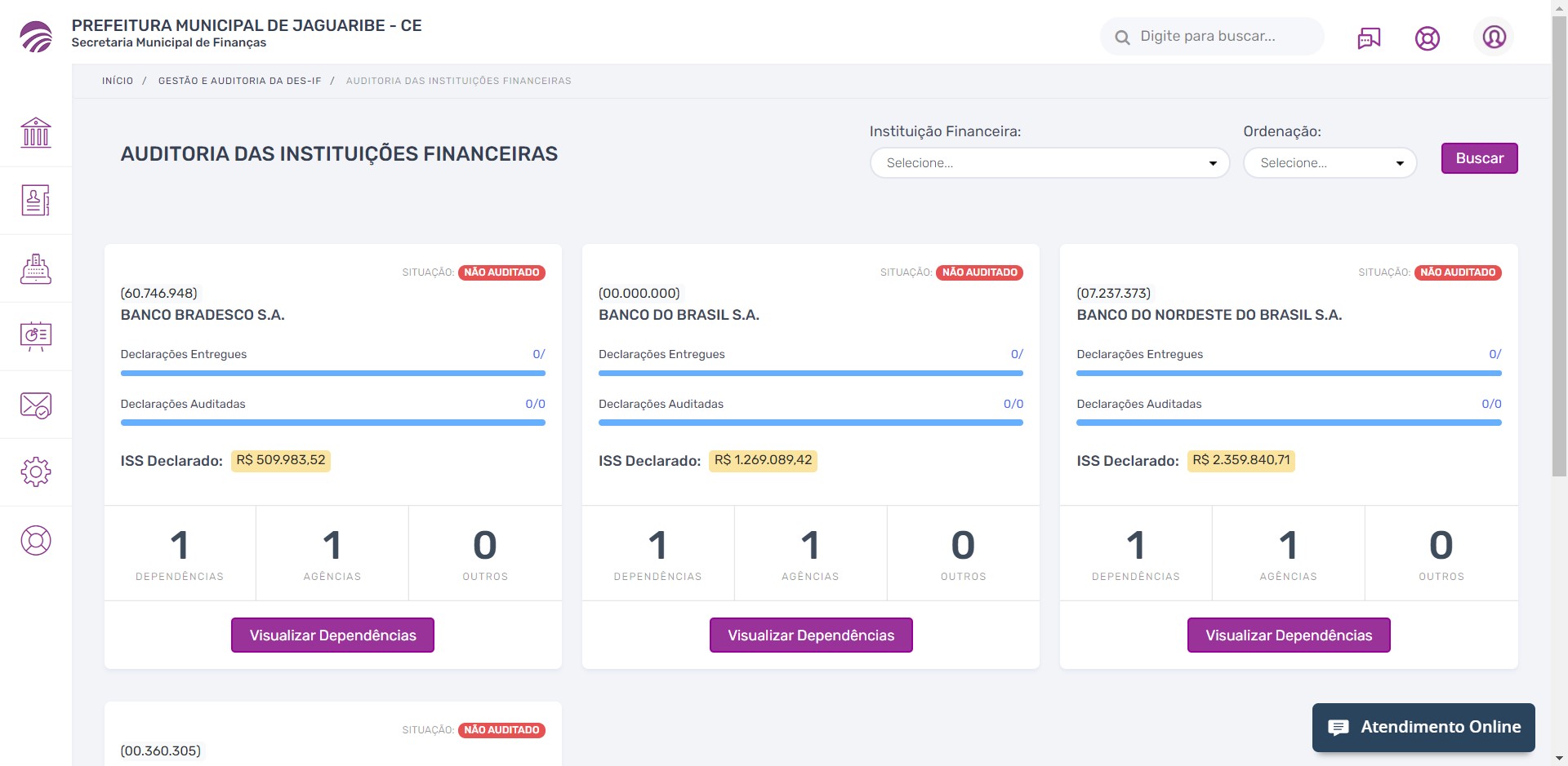 O Módulo de Auditoria oferece um conjunto de funcionalidades para gestão e auditoria da DES-IF para os Auditores Fiscais do município, seguindo as práticas de auditoria e fiscalização sugeridas pela própria ABRASF, bem como das melhores práticas de atuação de consultores tributários e auditores fiscais. As funcionalidades oferecidas permitem que o Fisco Municipal faça auditorias minuciosas nas declarações entregues pelas instituições financeiras do município, objetivando a apuração do Imposto Sobre Serviços de Qualquer Natureza (ISSQN) de operações das Instituições Financeiras. É o que há de mais avançado e eficaz de ferramenta tecnológica nesta matéria.